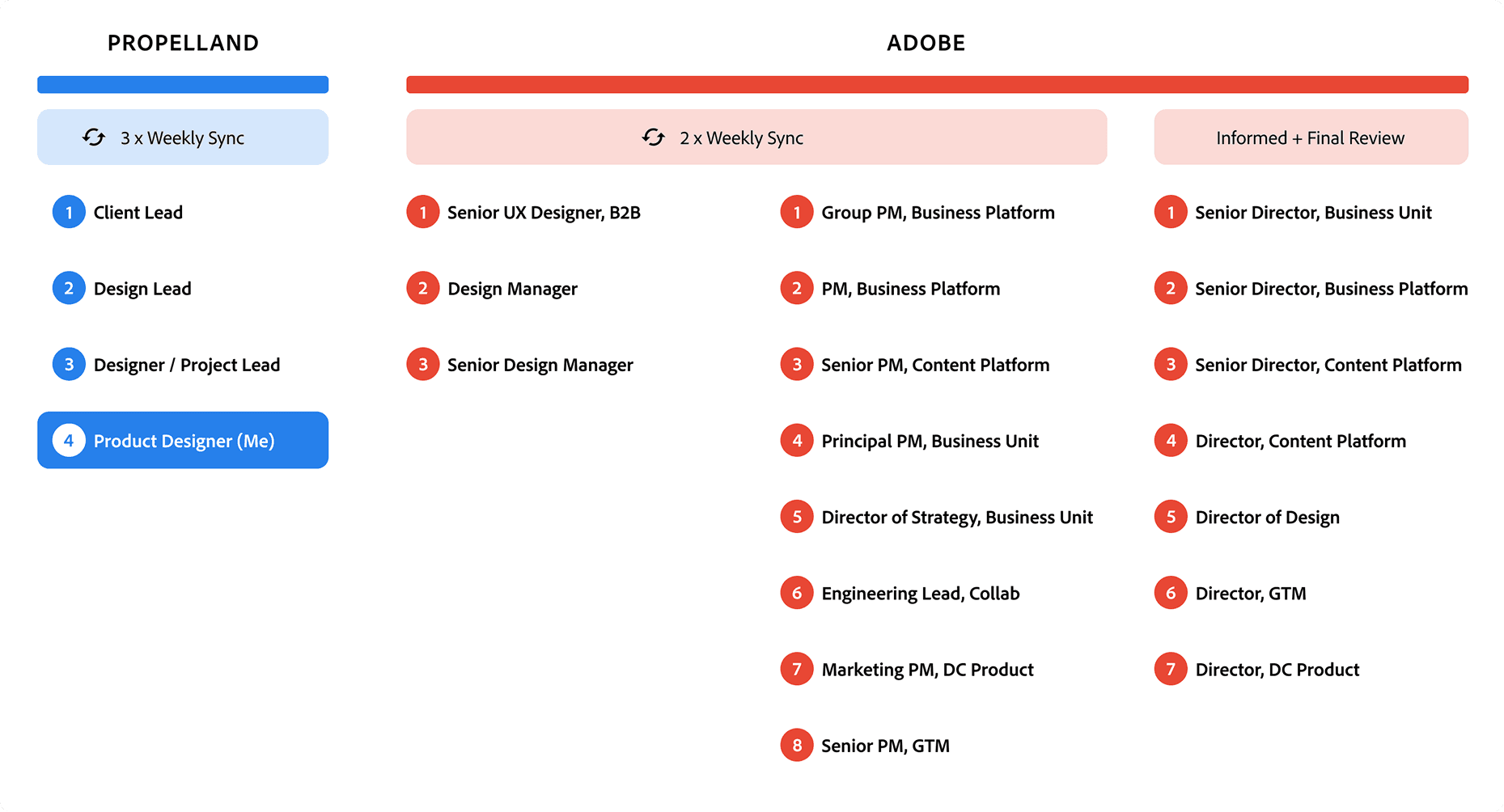 Project Lead (100%), Design Lead (5%), Client Lead (30%), 18 cross-platform Adobe stakeholders
