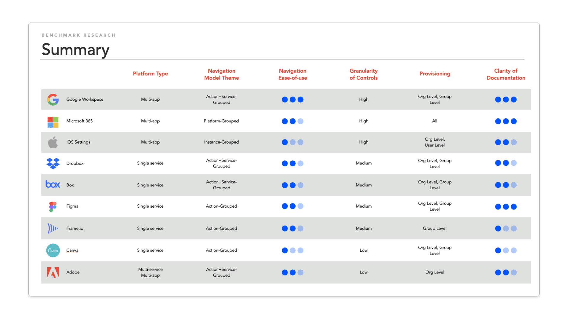 Benchmarked best-in-class admin console experiences and navigation patterns against Adobe.