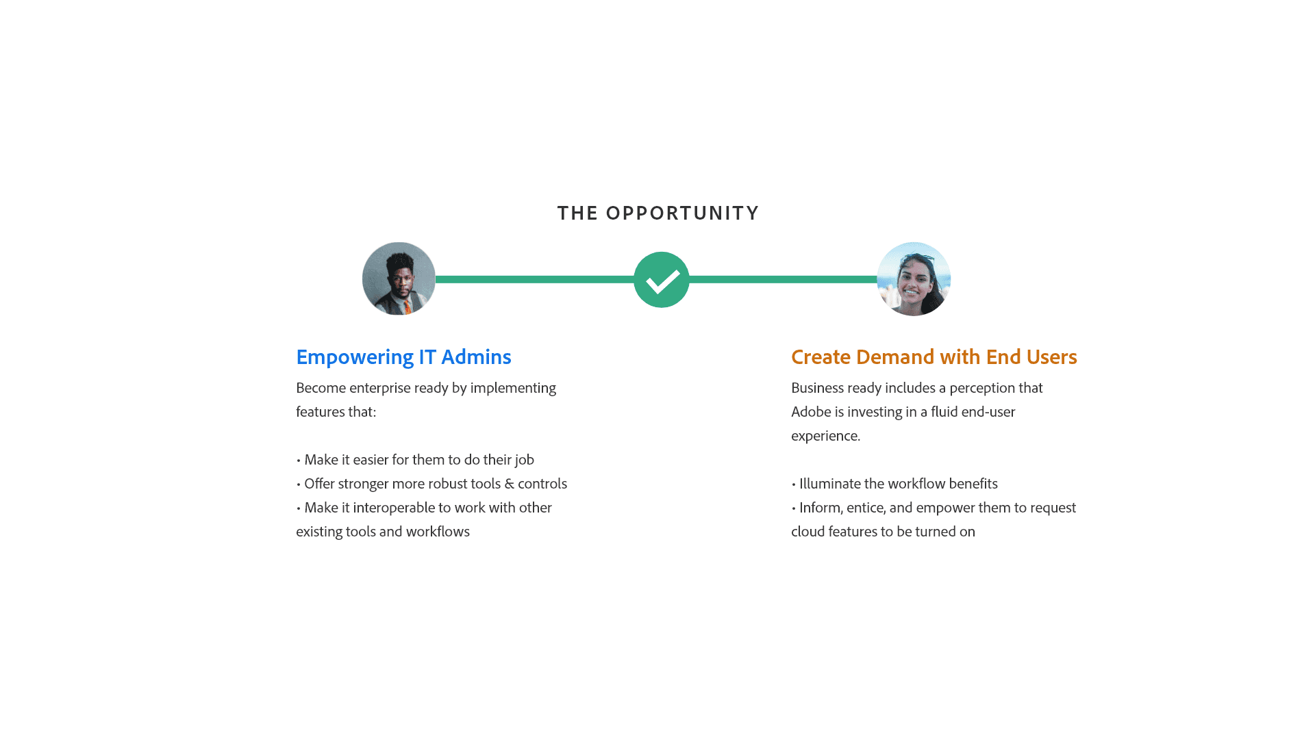 To show stakeholders the ease and control Adobe can bring to its enterprise admins and users, thereby establishing trust and increasing the cloud service adoption rate.