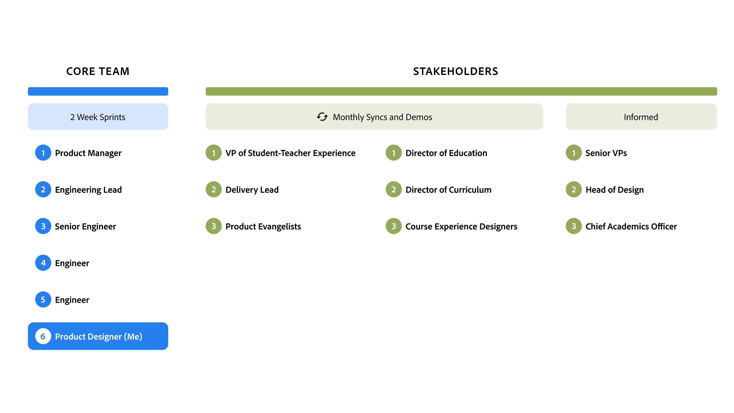 PM, Senior Eng Lead, 3 Engineers, 5 cross-functional stakeholders